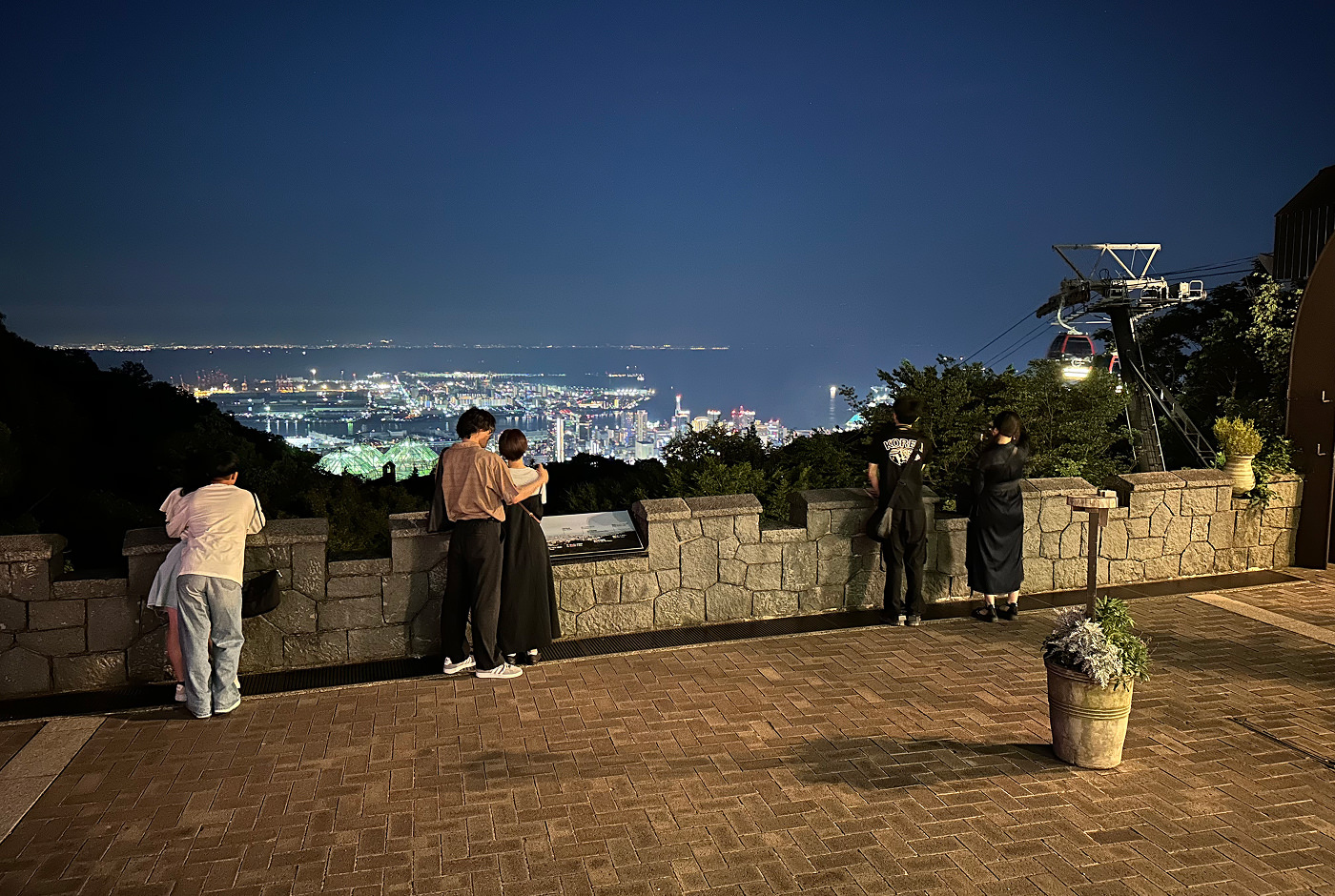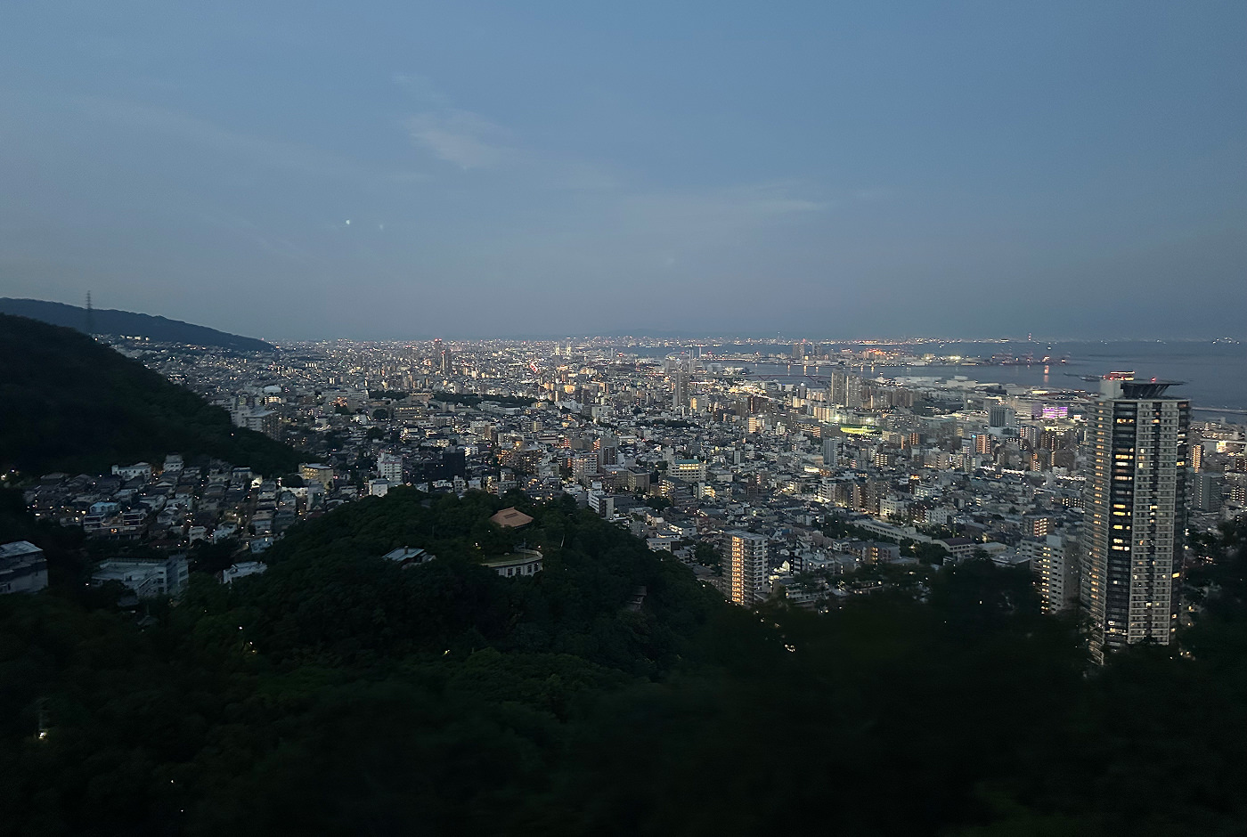 Medan jag väntade på nästa Shinkansen som skulle ta mig till Hiroshima såg jag linbanevagnar åka upp för Kobes stora och lummiga bergskedja Rokko.